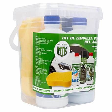 Contiene: lavaparabrisas 1L, limiasalpicaderos perfumado 250ml, champú para coche 1L, esponja, esponja limpiasalpicaderos perfumada y cubo de 7.50 L